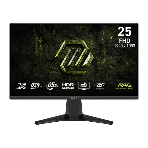 The MSI MAG 255F X24 24.5" 240Hz Rapid IPS FHD Gaming Monitor is built for speed, clarity, and competitive performance. With Full HD resolution, a rapid IPS panel, and ultra-fast 240Hz refresh rate, this MSI 24.5 inch gaming monitor delivers smooth visuals, accurate colors, and responsive gameplay. Perfect for esports players and enthusiasts, it combines cutting-edge technology with sleek design. 240Hz Refresh Rate & Rapid IPS Panel The standout 240Hz refresh rate ensures ultra-fluid motion, reducing screen tearing and stutter during fast-paced games. The Rapid IPS panel provides quick response times and vibrant color accuracy, making this MSI 240Hz Monitor ideal for competitive gaming and immersive experiences. Full HD Resolution & Wide Viewing Angles With a 1920x1080 Full HD resolution and 16:9 aspect ratio, the MSI MAG 255F X24 delivers sharp visuals and detailed clarity. Its IPS technology offers wide 178° viewing angles, ensuring consistent image quality whether used for gaming, streaming, or productivity. Esports-Ready Performance Designed for precision and consistency, the MSI MAG 255F X24 is tailored for esports players who demand speed and accuracy. Its rapid response times and smooth refresh rate make it a reliable MSI Gaming Monitor for competitive play and professional setups. Connectivity & Features Equipped with HDMI and DisplayPort inputs, the MSI MAG 255F X24 offers versatile connectivity for PCs and consoles. Its anti-glare display surface enhances comfort during long sessions, while the ergonomic design ensures stability and usability. Stylish & Functional Design The MSI MAG 255F X24 features a sleek, modern design with slim bezels, making it perfect for multi-monitor setups. Its combination of performance and aesthetics makes it a standout MSI 24.5 inch gaming monitor for both home and professional environments. Buy MSI MAG 255F X24 24.5" 240Hz Rapid IPS FHD Gaming Monitor from Star Tech In Bangladesh, you can get original MSI MAG 255F E20 24.5" 200Hz Gaming Monitor From Star Tech. We have a large collection of latest MSI Monitor to purchase for your Desktop PC. Order Online Or Visit your Nearest Star Tech Shop to get yours at lowest price. The MSI MAG 255F X24 24.5" 240Hz Rapid IPS FHD Gaming Monitor comes with 3 years warranty.